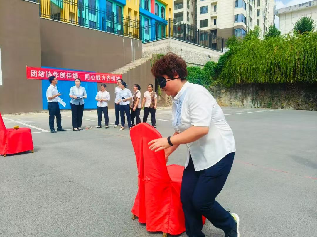 在歡笑聲、喝彩聲和加油聲中,競(jìng)賽拉開(kāi)帷幕;顒(dòng)分為蒙眼障礙走接力、你比我猜、驛站傳書(shū)、踩氣球、五人十足、心心相印......