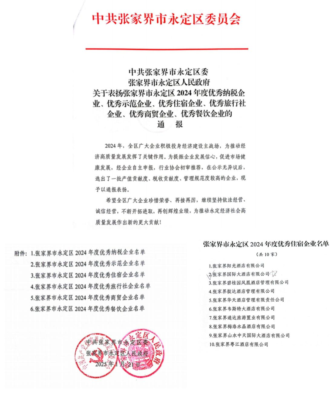 中共張家界市永定區(qū)委、張家界市永定區(qū)人民政府授予酒店 “張家界市永定區(qū)2024年優(yōu)秀住宿企業(yè)” 稱號。這一榮譽是對酒店綜合實力的高度認可。